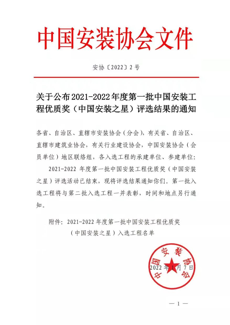 中國安裝工程優質獎(中國安裝之星)是我國安裝行業工程質量***高獎,申報這一獎項的工程應具高質量、新穎、創新、實用性強等特點。獲獎工程代表著國內安裝工程的先進技術和質量水平,為提高安裝行業工程質量水平起到了示范作用,業內人士形象稱之為“安裝工程的魯班獎”。